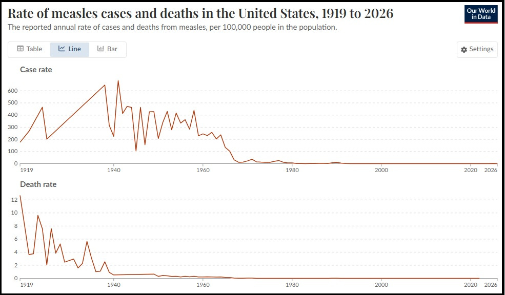 Like the graph above, this next image repeats the sharp decline in cases and deaths after 1963 and appears to validate the impressive testament to their success. (The top line indicates the rate of measles cases and the bottom the rate of deaths.)
