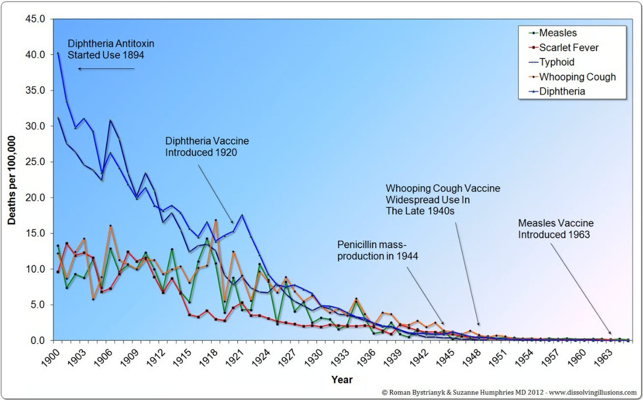 Official data clearly shows that measles deaths were dramatically decreasing long before the vaccine was introduced. The years following introduction merely extended the same mortality reduction pattern with no change.