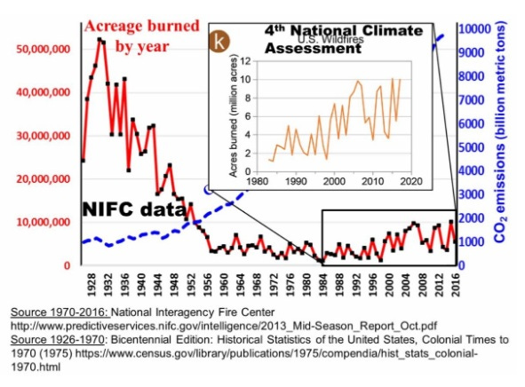 In an attempt to document their claim of increasing fires, the “science” provided in the report was a chart (inset of orange graph) that showed an increase in area burned for the United States from the National Interagency Fire Center (NIFC). Inspection of the chart, however, revealed that the data used was limited to information starting in 1983.